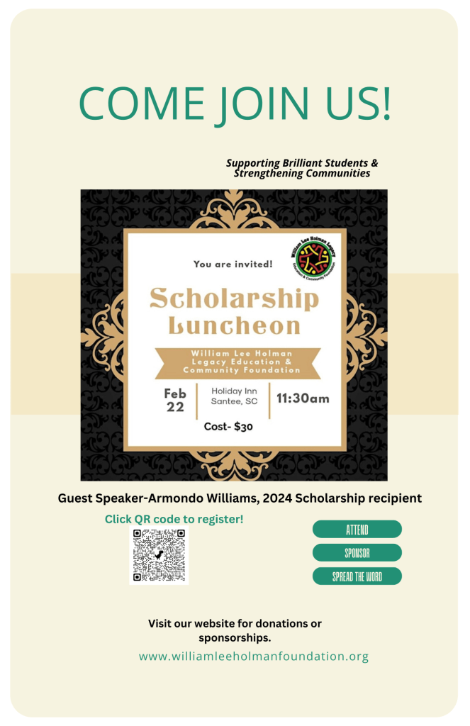 - Join our 2025 Scholarship luncheon from 11:30am-1:00pm at the Holiday Inn in Santee, SC and share with others. Register at link below:https://www.eventbrite.com/e/2025-scholarship-luncheon-by-william-lee-holman-legacy-foundation-tickets-1100539195359?utm-campaign=social&utm-content=attendeeshare&utm-medium=discovery&utm-term=listing&utm-source=cp&aff=ebdsshcopyurl