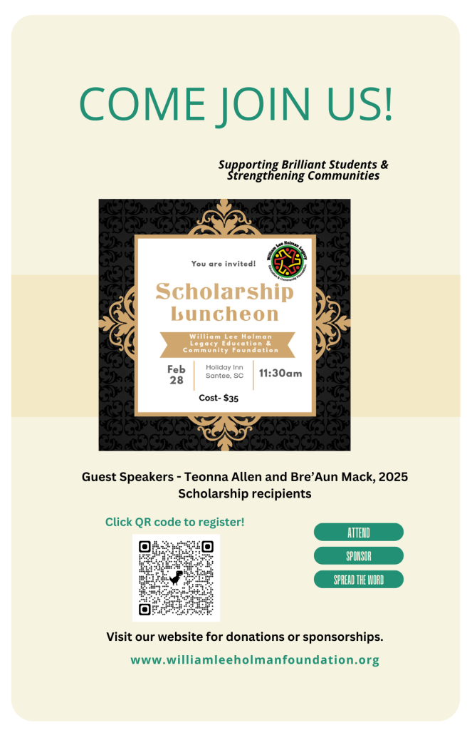 - Our 2026 William Lee Holman Legacy Education & Community Foundation Scholarship luncheon is on Saturday, February 28 in Santee, SC. It is scheduled from 11:30am-1pm. We are excited to have our 2025 Scholarship recipients as guest speakers. See link below to register to join us. Events & Community