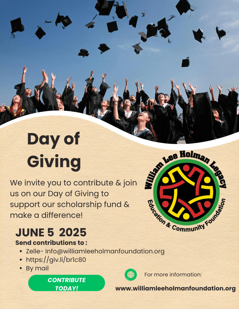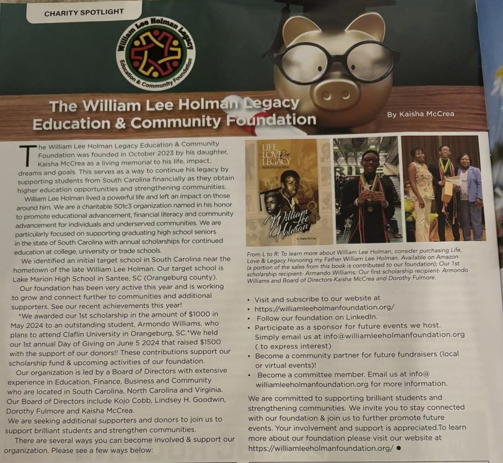 We are a charitable 501c3 organization named in the honor of, William Lee Holman, to promote educational advancement, financial literacy and community advancement for individuals and underserved communities. We are particularly focused on supporting graduating high school seniors in the state of South Carolina with annual scholarships for continued education at college, university or trade schools.